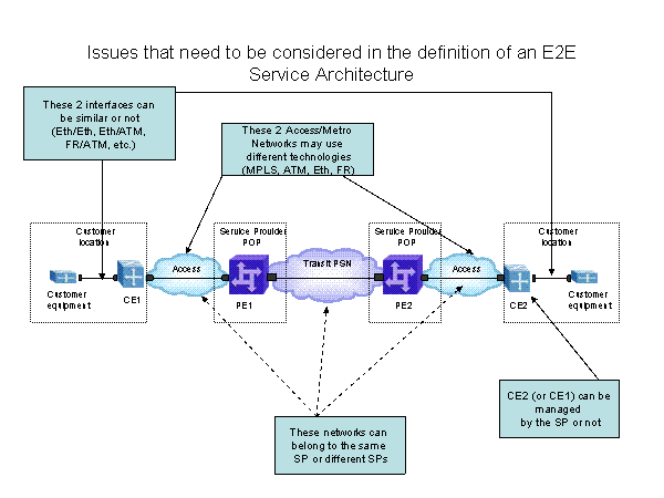 Issues that need to be considered in the definition of an E2E Service Architecture Service Provider POP Access Transit PSN Access Service Provider POP PE1 Customer location Customer location PE2 CE1 CE2 Customer equipment Customer equipment PE1 PE2 CE1 CE2 Customer equipment Customer equipment These 2 interfaces can be similar or not (Eth/Eth, Eth/ATM, FR/ATM, etc.) These networks can belong to the same SP or different SPs These 2 Access/Metro Networks may use different technologies (MPLS, ATM, Eth, FR) CE2 (or CE1) can be managed by the SP or not |