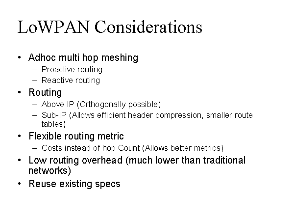 LoWPAN Considerations Adhoc multi hop meshing Proactive routing Reactive routing Routing Above IP (Orthogonally possible) Sub-IP (Allows efficient header compression, smaller route tables) Flexible routing metric Costs instead of hop Count (Allows better metrics) Low routing overhead (much lower than traditional networks) Reuse existing specs |