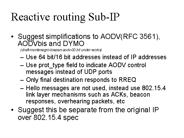 Reactive routing Sub-IP Suggest simplifications to AODV(RFC 3561), AODVbis and DYMO (draft-montenegro-lowpan-aodv-00.txt under works) Use 64 bit/16 bit addresses instead of IP addresses Use prot_type field to indicate AODV control messages instead of UDP ports Only final destination responds to RREQ Hello messages are not used, instead use 802.15.4 link layer mechanisms such as ACKs, beacon responses, overhearing packets, etc Suggest this be separate from the original IP over 802.15.4 spec |