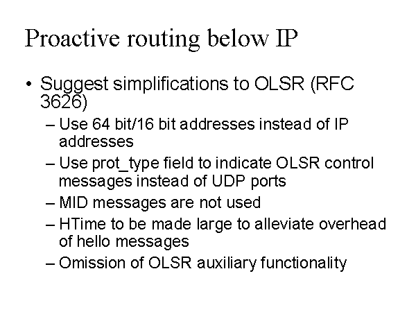 Proactive routing below IP Suggest simplifications to OLSR (RFC 3626) Use 64 bit/16 bit addresses instead of IP addresses Use prot_type field to indicate OLSR control messages instead of UDP ports MID messages are not used HTime to be made large to alleviate overhead of hello messages Omission of OLSR auxiliary functionality |
