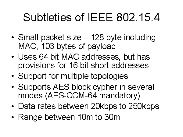 Subtleties of IEEE 802.15.4 Small packet size – 128 byte including MAC, 103 bytes of payload Uses 64 bit MAC addresses, but has provisions for 16 bit short addresses Support for multiple topologies Supports AES block cypher in several modes (AES-CCM-64 mandatory) Data rates between 20kbps to 250kbps Range between 10m to 30m |