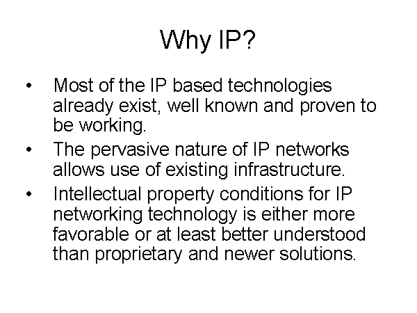 Why IP? Most of the IP based technologies already exist, well known and proven to be working. The pervasive nature of IP networks allows use of existing infrastructure. Intellectual property conditions for IP networking technology is either more favorable or at least better understood than proprietary and newer solutions. |
