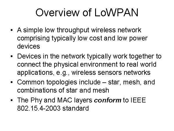 Overview of LoWPAN A simple low throughput wireless network comprising typically low cost and low power devices Devices in the network typically work together to connect the physical environment to real world applications, e.g., wireless sensors networks Common topologies include – star, mesh, and combinations of star and mesh The Phy and MAC layers conform to IEEE 802.15.4-2003 standard |