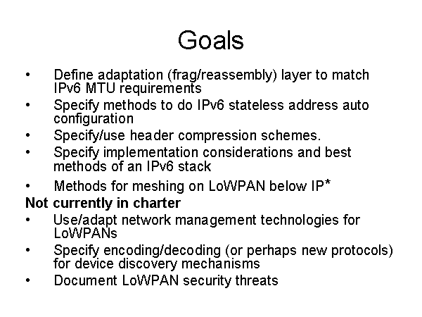 Define adaptation (frag/reassembly) layer to match IPv6 MTU requirements Specify methods to do IPv6 stateless address auto configuration Specify/use header compression schemes. Specify implementation considerations and best methods of an IPv6 stack Methods for meshing on LoWPAN below IP* Not currently in charter Use/adapt network management technologies for LoWPANs Specify encoding/decoding (or perhaps new protocols) for device discovery mechanisms Document LoWPAN security threats Goals |