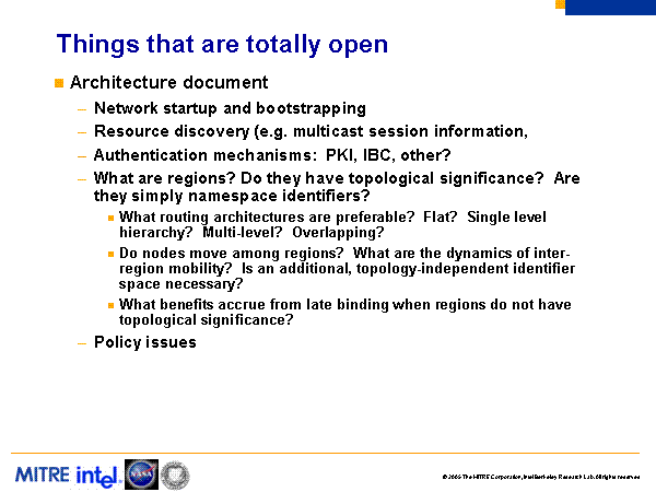 Things that are totally open Architecture document Network startup and bootstrapping Resource discovery (e.g. multicast session information, Authentication mechanisms: PKI, IBC, other? What are regions? Do they have topological significance? Are they simply namespace identifiers? What routing architectures are preferable? Flat? Single level hierarchy? Multi-level? Overlapping? Do nodes move among regions? What are the dynamics of inter-region mobility? Is an additional, topology-independent identifier space necessary? What benefits accrue from late binding when regions do not have topological significance? Policy issues |