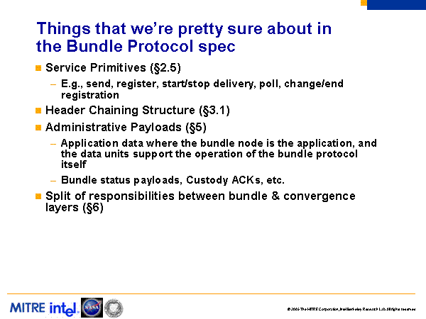 Things that we’re pretty sure about in the Bundle Protocol spec Service Primitives (§2.5) E.g., send, register, start/stop delivery, poll, change/end registration Header Chaining Structure (§3.1) Administrative Payloads (§5) Application data where the bundle node is the application, and the data units support the operation of the bundle protocol itself Bundle status payloads, Custody ACKs, etc. Split of responsibilities between bundle & convergence layers (§6) |