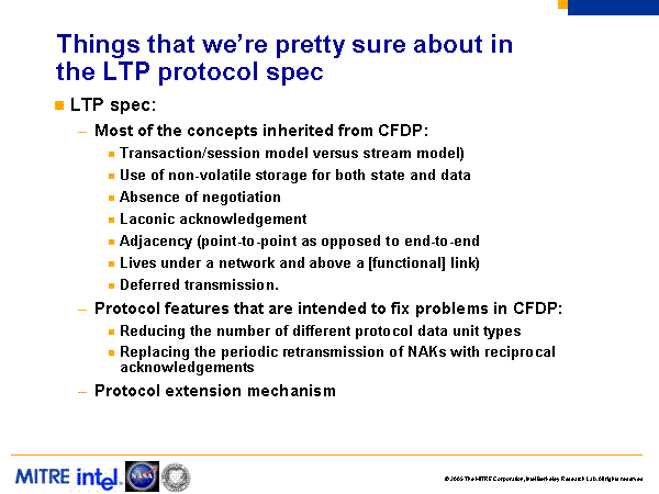 Things that we’re pretty sure about in the LTP protocol spec LTP spec: Most of the concepts inherited from CFDP: Transaction/session model versus stream model) Use of non-volatile storage for both state and data Absence of negotiation Laconic acknowledgement Adjacency (point-to-point as opposed to end-to-end Lives under a network and above a [functional] link) Deferred transmission. Protocol features that are intended to fix problems in CFDP: Reducing the number of different protocol data unit types Replacing the periodic retransmission of NAKs with reciprocal acknowledgements Protocol extension mechanism |