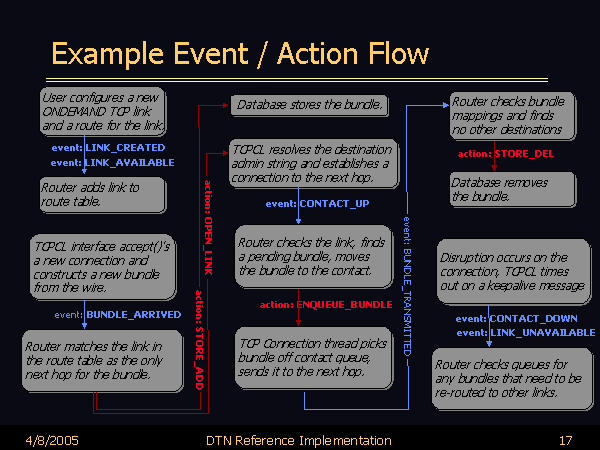 Example Event / Action Flow TCPCL interface accept()’s a new connection and constructs a new bundle from the wire. User configures a new ONDEMAND TCP link and a route for the link. event: LINK_CREATED event: LINK_AVAILABLE Router adds link to route table. Router matches the link in the route table as the only next hop for the bundle. event: BUNDLE_ARRIVED TCPCL resolves the destination admin string and establishes a connection to the next hop. event: CONTACT_UP Router checks the link, finds a pending bundle, moves the bundle to the contact. action: ENQUEUE_BUNDLE TCP Connection thread picks bundle off contact queue, sends it to the next hop. Database stores the bundle. Database removes the bundle. action: STORE_DEL Router checks bundle mappings and finds no other destinations Disruption occurs on the connection, TCPCL times out on a keepalive message Router checks queues for any bundles that need to be re-routed to other links. event: CONTACT_DOWN event: LINK_UNAVAILABLE |