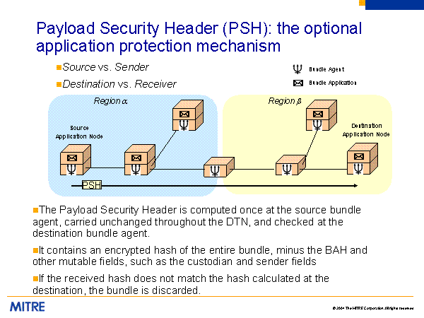 Payload Security Header (PSH): the optional application protection mechanism Bundle Agent Region ? Region ? Source Application Node Destination Application Node The Payload Security Header is computed once at the source bundle agent, carried unchanged throughout the DTN, and checked at the destination bundle agent. It contains an encrypted hash of the entire bundle, minus the BAH and other mutable fields, such as the custodian and sender fields If the received hash does not match the hash calculated at the destination, the bundle is discarded. PSH Source vs. Sender Destination vs. Receiver |