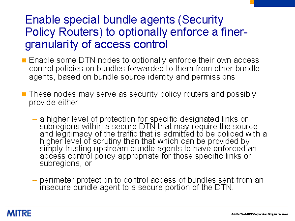 Enable special bundle agents (Security Policy Routers) to optionally enforce a finer-granularity of access control Enable some DTN nodes to optionally enforce their own access control policies on bundles forwarded to them from other bundle agents, based on bundle source identity and permissions These nodes may serve as security policy routers and possibly provide either a higher level of protection for specific designated links or subregions within a secure DTN that may require the source and legitimacy of the traffic that is admitted to be policed with a higher level of scrutiny than that which can be provided by simply trusting upstream bundle agents to have enforced an access control policy appropriate for those specific links or subregions, or perimeter protection to control access of bundles sent from an insecure bundle agent to a secure portion of the DTN. |