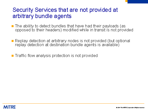 The ability to detect bundles that have had their payloads (as opposed to their headers) modified while in transit is not provided Replay detection at arbitrary nodes is not provided (but optional replay detection at destination bundle agents is available) Traffic flow analysis protection is not provided Security Services that are not provided at arbitrary bundle agents |