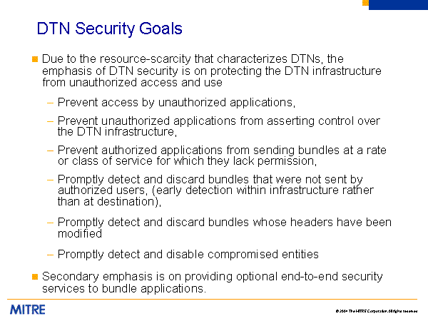 DTN Security Goals Due to the resource-scarcity that characterizes DTNs, the emphasis of DTN security is on protecting the DTN infrastructure from unauthorized access and use Prevent access by unauthorized applications, Prevent unauthorized applications from asserting control over the DTN infrastructure, Prevent authorized applications from sending bundles at a rate or class of service for which they lack permission, Promptly detect and discard bundles that were not sent by authorized users, (early detection within infrastructure rather than at destination), Promptly detect and discard bundles whose headers have been modified Promptly detect and disable compromised entities Secondary emphasis is on providing optional end-to-end security services to bundle applications. |