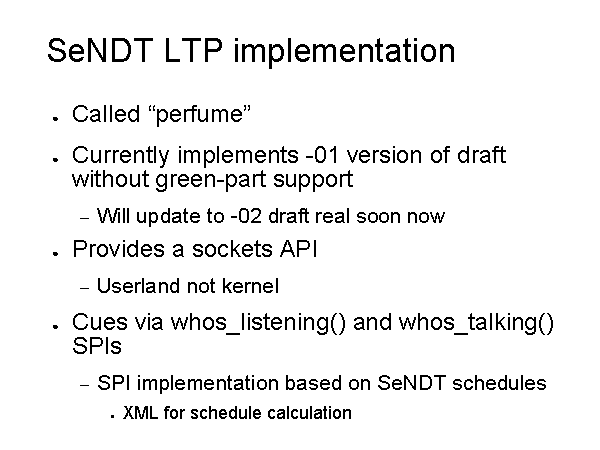 SeNDT LTP implementation Called “perfume” Currently implements -01 version of draft without green-part support Will update to -02 draft real soon now Provides a sockets API Userland not kernel Cues via whos_listening() and whos_talking() SPIs SPI implementation based on SeNDT schedules XML for schedule calculation |