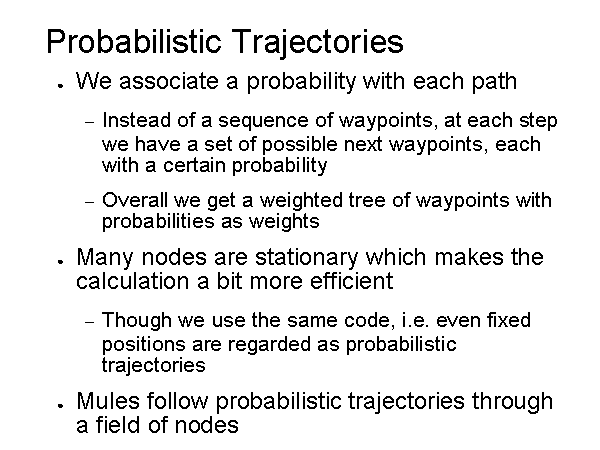 Probabilistic Trajectories We associate a probability with each path Instead of a sequence of waypoints, at each step we have a set of possible next waypoints, each with a certain probability Overall we get a weighted tree of waypoints with probabilities as weights Many nodes are stationary which makes the calculation a bit more efficient Though we use the same code, i.e. even fixed positions are regarded as probabilistic trajectories Mules follow probabilistic trajectories through a field of nodes |