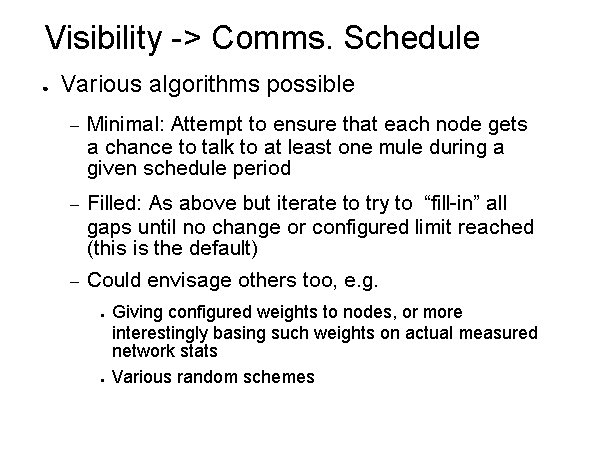 Visibility -> Comms. Schedule Various algorithms possible Minimal: Attempt to ensure that each node gets a chance to talk to at least one mule during a given schedule period Filled: As above but iterate to try to “fill-in” all gaps until no change or configured limit reached (this is the default) Could envisage others too, e.g. Giving configured weights to nodes, or more interestingly basing such weights on actual measured network stats Various random schemes |