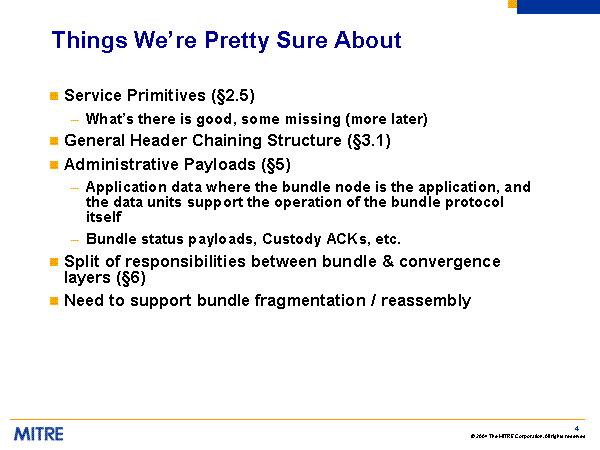 Things We’re Pretty Sure About Service Primitives (§2.5) What’s there is good, some missing (more later) General Header Chaining Structure (§3.1) Administrative Payloads (§5) Application data where the bundle node is the application, and the data units support the operation of the bundle protocol itself Bundle status payloads, Custody ACKs, etc. Split of responsibilities between bundle & convergence layers (§6) Need to support bundle fragmentation / reassembly |