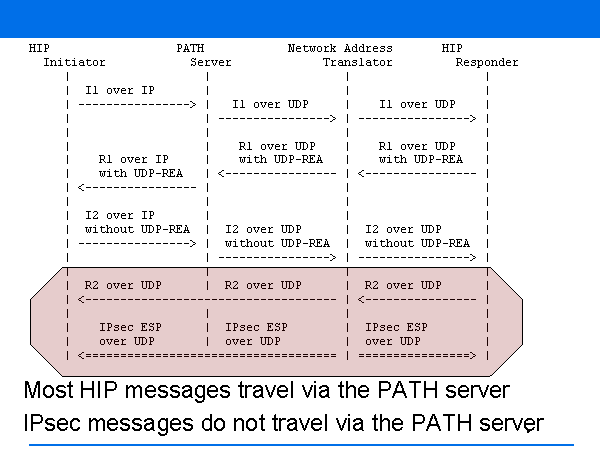 HIP PATH Network Address HIP Initiator Server Translator Responder | | | | | I1 over IP | | | | ----------------> | I1 over UDP | I1 over UDP | | | ----------------> | ----------------> | | | | | | | R1 over UDP | R1 over UDP | | R1 over IP | with UDP-REA | with UDP-REA | | with UDP-REA | <---------------- | <---------------- | | <---------------- | | | | | | | | I2 over IP | | | | without UDP-REA | I2 over UDP | I2 over UDP | | ----------------> | without UDP-REA | without UDP-REA | | | ----------------> | ----------------> | | | | | | R2 over UDP | R2 over UDP | R2 over UDP | | <------------------------------------ | <---------------- | | | | | | IPsec ESP | IPsec ESP | IPsec ESP | | over UDP | over UDP | over UDP | | <==================================== | ================> | Most HIP messages travel via the PATH server IPsec messages do not travel via the PATH server |