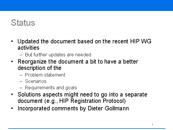 Status Updated the document based on the recent HIP WG activities But further updates are needed Reorganize the document a bit to have a better description of the Problem statement Scenarios Requirements and goals Solutions aspects might need to go into a separate document (e.g., HIP Registration Protocol) Incorporated comments by Dieter Gollmann |