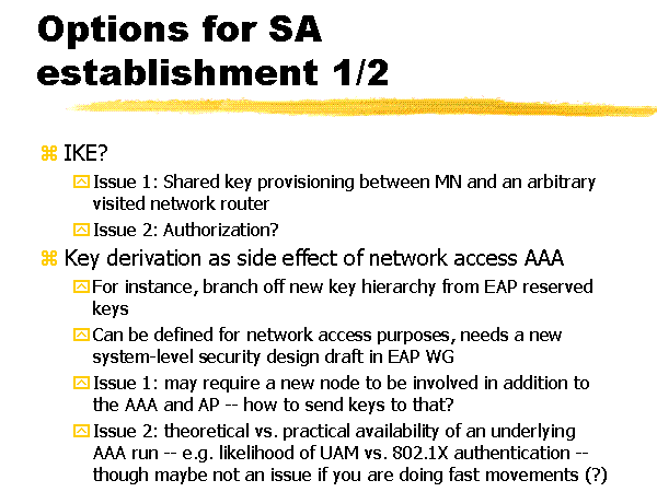 Options for SA establishment 1/2 IKE? Issue 1: Shared key provisioning between MN and an arbitrary visited network router Issue 2: Authorization? Key derivation as side effect of network access AAA For instance, branch off new key hierarchy from EAP reserved keys Can be defined for network access purposes, needs a new system-level security design draft in EAP WG Issue 1: may require a new node to be involved in addition to the AAA and AP -- how to send keys to that? Issue 2: theoretical vs. practical availability of an underlying AAA run -- e.g. likelihood of UAM vs. 802.1X authentication -- though maybe not an issue if you are doing fast movements (?) |