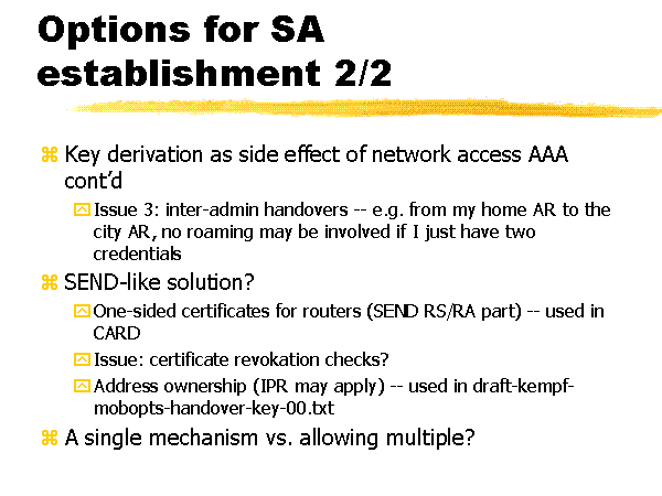 Options for SA establishment 2/2 Key derivation as side effect of network access AAA cont’d Issue 3: inter-admin handovers -- e.g. from my home AR to the city AR, no roaming may be involved if I just have two credentials SEND-like solution? One-sided certificates for routers (SEND RS/RA part) -- used in CARD Issue: certificate revokation checks? Address ownership (IPR may apply) -- used in draft-kempf-mobopts-handover-key-00.txt A single mechanism vs. allowing multiple? |