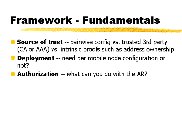 Source of trust -- pairwise config vs. trusted 3rd party (CA or AAA) vs. intrinsic proofs such as address ownership