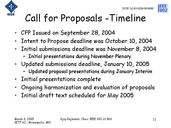 Call for Proposals -Timeline CFP Issued on September 28, 2004 Intent to Propose deadline was October 10, 2004 Initial submissions deadline was November 8, 2004 Initial presentations during November Plenary Updated submissions deadline, January 10, 2005 Updated proposal presentations during January Interim Initial presentations complete Ongoing harmonization and evaluation of proposals Initial draft text scheduled for May 2005 |