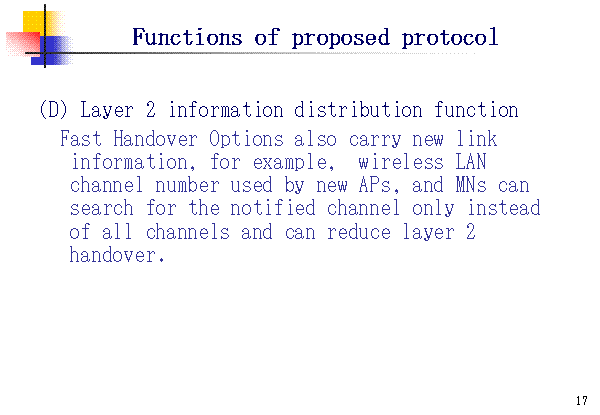Functions of proposed protocol (D) Layer 2 information distribution function Fast Handover Options also carry new link information, for example, wireless LAN channel number used by new APs, and MNs can search for the notified channel only instead of all channels and can reduce layer 2 handover. |