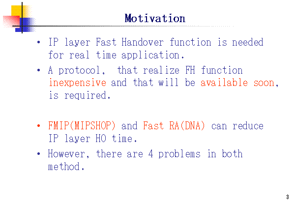 FMIP(MIPSHOP) and Fast RA(DNA) can reduce IP layer HO time.