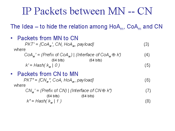 IP Packets between MN -- CN The Idea – to hide the relation among HoAm, CoAm and CN Packets from MN to CN PKT’ = {CoAm’, CN, HoAm, payload} (3) where CoAm’ = (Prefix of CoAm) | (Interface of CoAm Å k’) (4) (64 bits) (64 bits) k’ = Hash( km | 0 ) (5) Packets from CN to MN PKT” = {CNm”, CoA, HoAm, payload} (6) where CNm’ = (Prefix of CN) | (Interface of CN Å k”) (7) (64 bits) (64 bits) k” = Hash( km | 1 ) (8) |