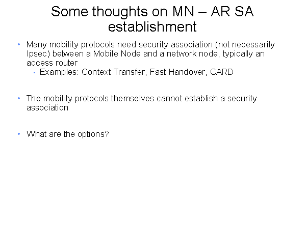 Some thoughts on MN – AR SA establishment Many mobility protocols need security association (not necessarily Ipsec) between a Mobile Node and a network node, typically an access router Examples: Context Transfer, Fast Handover, CARD The mobility protocols themselves cannot establish a security association What are the options? |