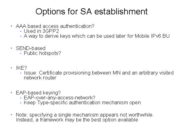 Options for SA establishment AAA based access authentication? Used in 3GPP2 A way to derive keys which can be used later for Mobile IPv6 BU SEND-based Public hotspots? IKE? Issue: Certificate provisioning between MN and an arbitrary visited network router EAP-based keying? EAP-over-any-access-network? Keep Type-specific authentication mechanism open Note: specifying a single mechanism appears not worthwhile. Instead, a framework may be the best option available |