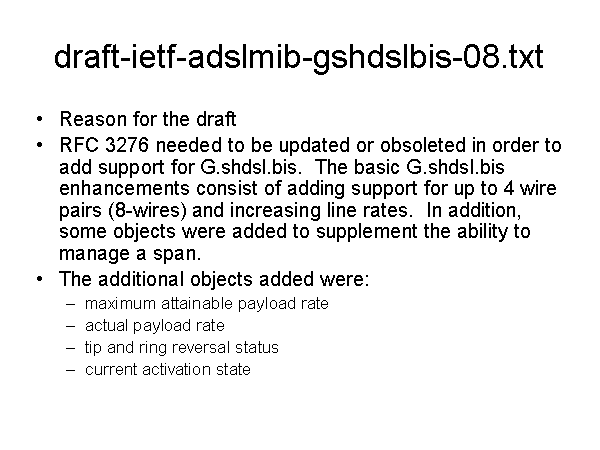 draft-ietf-adslmib-gshdslbis-08.txt Reason for the draft RFC 3276 needed to be updated or obsoleted in order to add support for G.shdsl.bis. The basic G.shdsl.bis enhancements consist of adding support for up to 4 wire pairs (8-wires) and increasing line rates. In addition, some objects were added to supplement the ability to manage a span. The additional objects added were: maximum attainable payload rate actual payload rate tip and ring reversal status current activation state |
