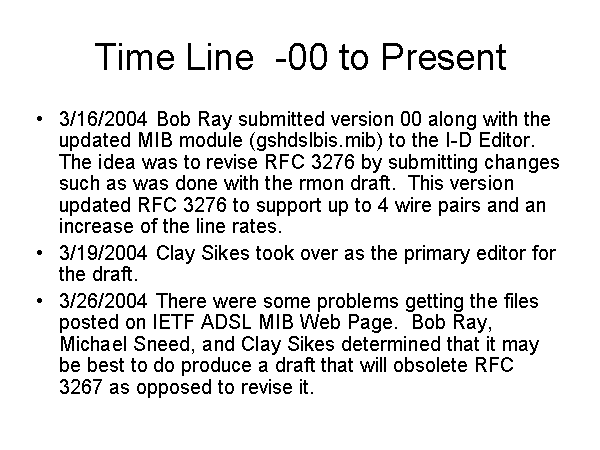 Time Line -00 to Present 3/16/2004 Bob Ray submitted version 00 along with the updated MIB module (gshdslbis.mib) to the I-D Editor. The idea was to revise RFC 3276 by submitting changes such as was done with the rmon draft. This version updated RFC 3276 to support up to 4 wire pairs and an increase of the line rates. 3/19/2004 Clay Sikes took over as the primary editor for the draft. 3/26/2004 There were some problems getting the files posted on IETF ADSL MIB Web Page. Bob Ray, Michael Sneed, and Clay Sikes determined that it may be best to do produce a draft that will obsolete RFC 3267 as opposed to revise it. |