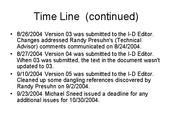 Time Line (continued) 8/26/2004 Version 03 was submitted to the I-D Editor. Changes addressed Randy Presuhn's (Technical Advisor) comments communicated on 8/24/2004. 8/27/2004 Version 04 was submitted to the I-D Editor. When 03 was submitted, the text in the document wasn't updated to 03. 9/10/2004 Version 05 was submitted to the I-D Editor. Cleaned up some dangling references discovered by Randy Presuhn on 9/2/2004. 9/23/2004 Michael Sneed issued a deadline for any additional issues for 10/30/2004. |