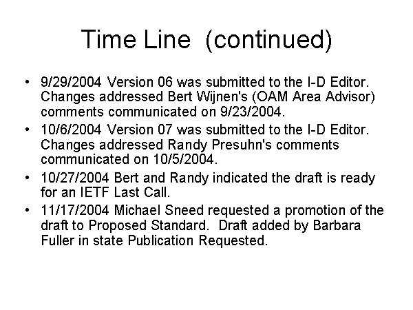Time Line (continued) 9/29/2004 Version 06 was submitted to the I-D Editor. Changes addressed Bert Wijnen's (OAM Area Advisor) comments communicated on 9/23/2004. 10/6/2004 Version 07 was submitted to the I-D Editor. Changes addressed Randy Presuhn's comments communicated on 10/5/2004. 10/27/2004 Bert and Randy indicated the draft is ready for an IETF Last Call. 11/17/2004 Michael Sneed requested a promotion of the draft to Proposed Standard. Draft added by Barbara Fuller in state Publication Requested. |