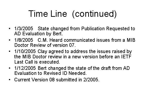Time Line (continued) 1/3/2005 State changed from Publication Requested to AD Evaluation by Bert. 1/8/2005 C.M. Heard communicated issues from a MIB Doctor Review of version 07. 1/10/2005 Clay agreed to address the issues raised by the MIB Doctor review in a new version before an IETF Last Call is executed. 1/12/2005 Bert changed the state of the draft from AD Evaluation to Revised ID Needed. Current Version 08 submitted in 2/2005. |