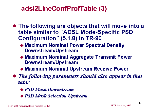 adsl2LineConfProfTable (3) The following are objects that will move into a table similar to “ADSL Mode-Specific PSD Configuration” (5.1.8) in TR-90 Maximum Nominal Power Spectral Density Downstream/Upstream Maximum Nominal Aggregate Transmit Power Downstream/Upstream Maximum Nominal Upstream Receive Power The following parameters should also appear in that table PSD Mask Downstream PSD Mask Selection Upstream |