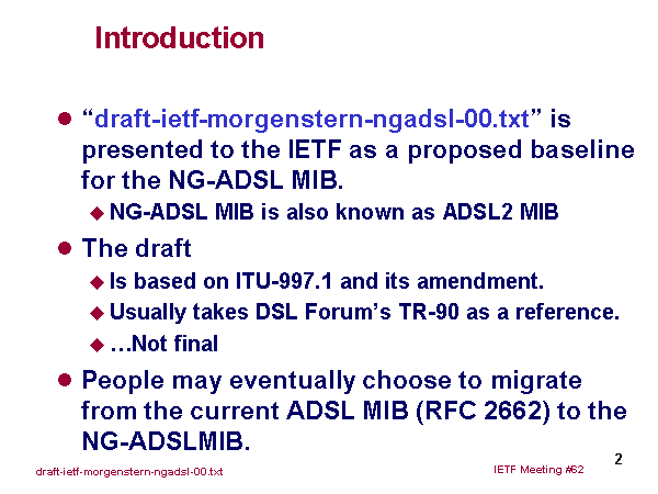Introduction “draft-ietf-morgenstern-ngadsl-00.txt” is presented to the IETF as a proposed baseline for the NG-ADSL MIB. NG-ADSL MIB is also known as ADSL2 MIB The draft Is based on ITU-997.1 and its amendment. Usually takes DSL Forum’s TR-90 as a reference. …Not final People may eventually choose to migrate from the current ADSL MIB (RFC 2662) to the NG-ADSLMIB. |