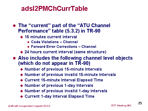 adsl2PMChCurrTable The “current” part of the “ATU Channel Performance” table (5.3.2) in TR-90 15 minutes current interval Code Violations – Channel Forward Error Corrections – Channel 24 hours current interval (same structure) Also includes the following channel level objects (which do not appear in TR-90) Number of previous 15-minute Intervals Number of previous invalid 15-minute Intervals Current 15-minute Interval Elapsed Time Number of previous 1-day Intervals Number of previous invalid 1-day intervals Current 1-day Interval Elapsed Time |
