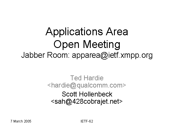 Applications AreaOpen MeetingJabber Room: apparea@ietf.xmpp.org