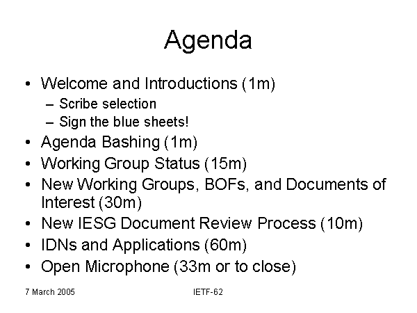 Agenda Welcome and Introductions (1m) Scribe selection Sign the blue sheets! Agenda Bashing (1m) Working Group Status (15m) New Working Groups, BOFs, and Documents of Interest (30m) New IESG Document Review Process (10m) IDNs and Applications (60m) Open Microphone (33m or to close) |