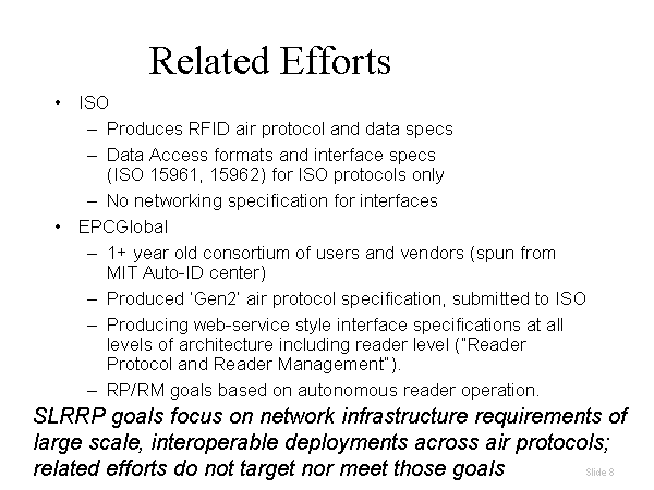Related Efforts ISO Produces RFID air protocol and data specs Data Access formats and interface specs (ISO 15961, 15962) for ISO protocols only No networking specification for interfaces EPCGlobal 1+ year old consortium of users and vendors (spun from MIT Auto-ID center) Produced ‘Gen2’ air protocol specification, submitted to ISO Producing web-service style interface specifications at all levels of architecture including reader level (“Reader Protocol and Reader Management”). RP/RM goals based on autonomous reader operation. SLRRP goals focus on network infrastructure requirements of large scale, interoperable deployments across air protocols; related efforts do not target nor meet those goals |