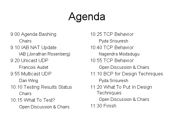 Agenda 9:00 Agenda Bashing Chairs 9:10 IAB NAT Update IAB (Jonathan Rosenberg) 9:20 Unicast UDP Francois Audet 9:55 Multicast UDP Dan Wing 10:10 Testing Results Status Chairs 10:15 What To Test? Open Discussion & Chairs 10:25 TCP Behavior Pyda Srisuresh 10:40 TCP Behavior Nagendra Modadugu 10:55 TCP Behavior Open Discussion & Chairs 11:10 BCP for Design Techniques Pyda Srisuresh 11:20 What To Put In Design Techniques Open Discussion & Chairs 11:30 Finish |