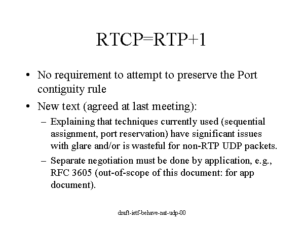 RTCP=RTP+1 No requirement to attempt to preserve the Port contiguity rule New text (agreed at last meeting): Explaining that techniques currently used (sequential assignment, port reservation) have significant issues with glare and/or is wasteful for non-RTP UDP packets. Separate negotiation must be done by application, e.g., RFC 3605 (out-of-scope of this document: for app document). |