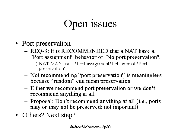 Open issues Port preservation REQ-3: It is RECOMMENDED that a NAT have a "Port assignment" behavior of "No port preservation". NAT MAY use a "Port assignment" behavior of "Port preservation". Not recommending “port preservation” is meaningless because “random” can mean preservation Either we recommend port preservation or we don’t recommend anything at all Proposal: Don’t recommend anything at all (i.e., ports may or may not be preserved: not important) Others? Next step? |