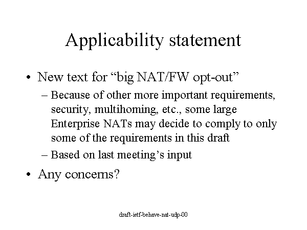 Applicability statement New text for “big NAT/FW opt-out” Because of other more important requirements, security, multihoming, etc., some large Enterprise NATs may decide to comply to only some of the requirements in this draft Based on last meeting’s input Any concerns? |