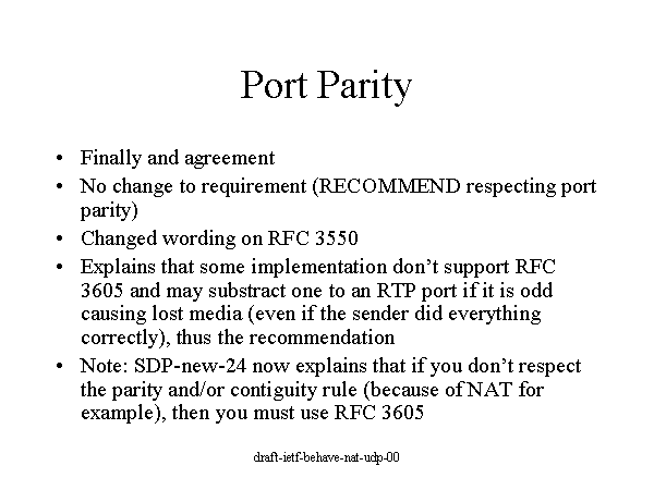 Port Parity Finally and agreement No change to requirement (RECOMMEND respecting port parity) Changed wording on RFC 3550 Explains that some implementation don’t support RFC 3605 and may substract one to an RTP port if it is odd causing lost media (even if the sender did everything correctly), thus the recommendation Note: SDP-new-24 now explains that if you don’t respect the parity and/or contiguity rule (because of NAT for example), then you must use RFC 3605 |