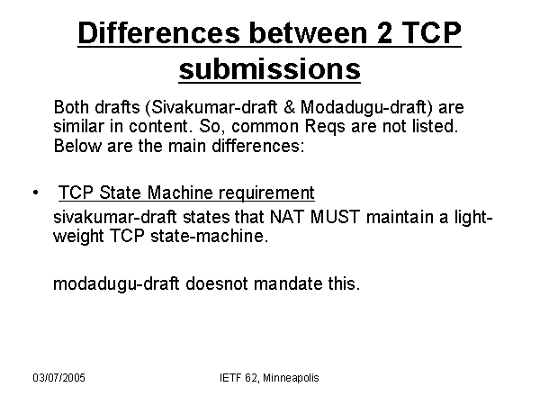 Differences between 2 TCP submissions Both drafts (Sivakumar-draft & Modadugu-draft) are similar in content. So, common Reqs are not listed. Below are the main differences: TCP State Machine requirement sivakumar-draft states that NAT MUST maintain a light-weight TCP state-machine. modadugu-draft doesnot mandate this. |