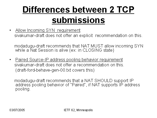 Differences between 2 TCP submissions Allow Incoming SYN requirement sivakumar-draft does not offer an explicit recommendation on this. modadugu-draft recommends that NAT MUST allow incoming SYN while a Nat Session is alive (ex: in CLOSING state) Paired Source-IP address pooling behavior requirement sivakumar-draft does not offer a recommendation on this. (draft-ford-behave-gen-00.txt covers this) modadugu-draft recommends that a NAT SHOULD support IP address pooling behavior of “Paired”, if NAT supports IP address pooling. |