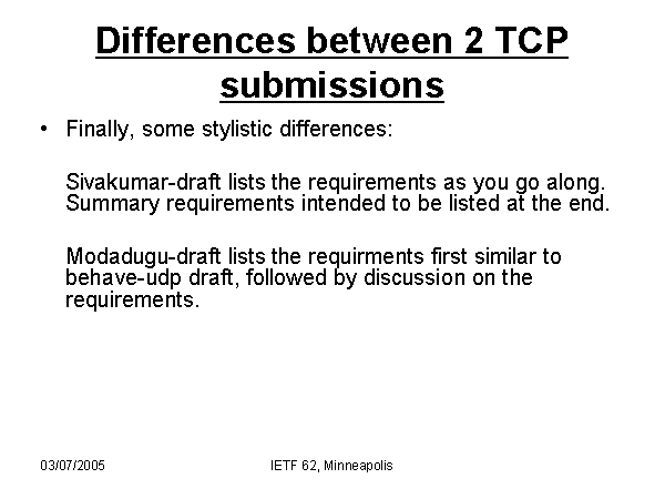 Differences between 2 TCP submissions Finally, some stylistic differences: Sivakumar-draft lists the requirements as you go along. Summary requirements intended to be listed at the end. Modadugu-draft lists the requirments first similar to behave-udp draft, followed by discussion on the requirements. |